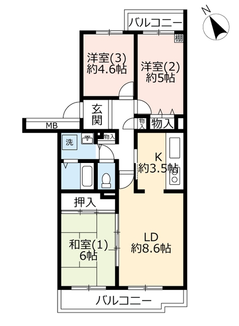 | 間取り詳細 | 和室6畳/洋室5畳/洋室4.6畳/K3.5畳/LD8.6畳 | 使用部位 | 1階号室 |