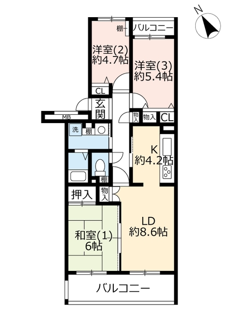 | 間取り詳細 | 和室6畳/洋室5.4畳/洋室4.7畳/K4.2畳/LD8.6畳 | 使用部位 | 3階号室 |