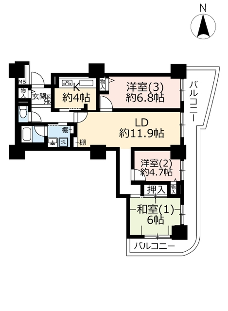 | 間取り詳細 | 和室5.5畳/洋室6.8畳/洋室4.7畳/K4畳/LD11.9畳 | 使用部位 | 7階号室 |