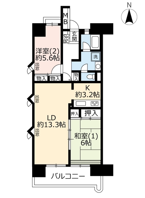 | 間取り詳細 | 和室6畳/洋室5.6畳/K3.2畳/LD13.3畳 | 使用部位 | 2階号室 |