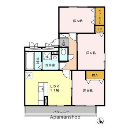 | 間取り詳細 | 洋室6畳/洋室6畳/洋室6畳/LDK11畳 | 使用部位 | 1階号室 |