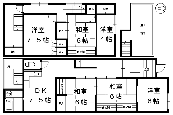 | 間取り詳細 | 和室6畳/和室6畳/和室6畳/洋室7.5畳/洋室6畳/洋室4畳/DK7.5畳 | 使用部位 | 1階号室 |