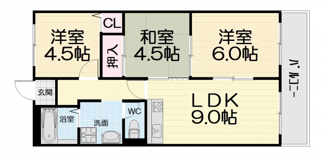 | 間取り詳細 | 和室4.5畳/洋室6畳/洋室4.5畳/LDK9畳 | 使用部位 | 4階号室 |